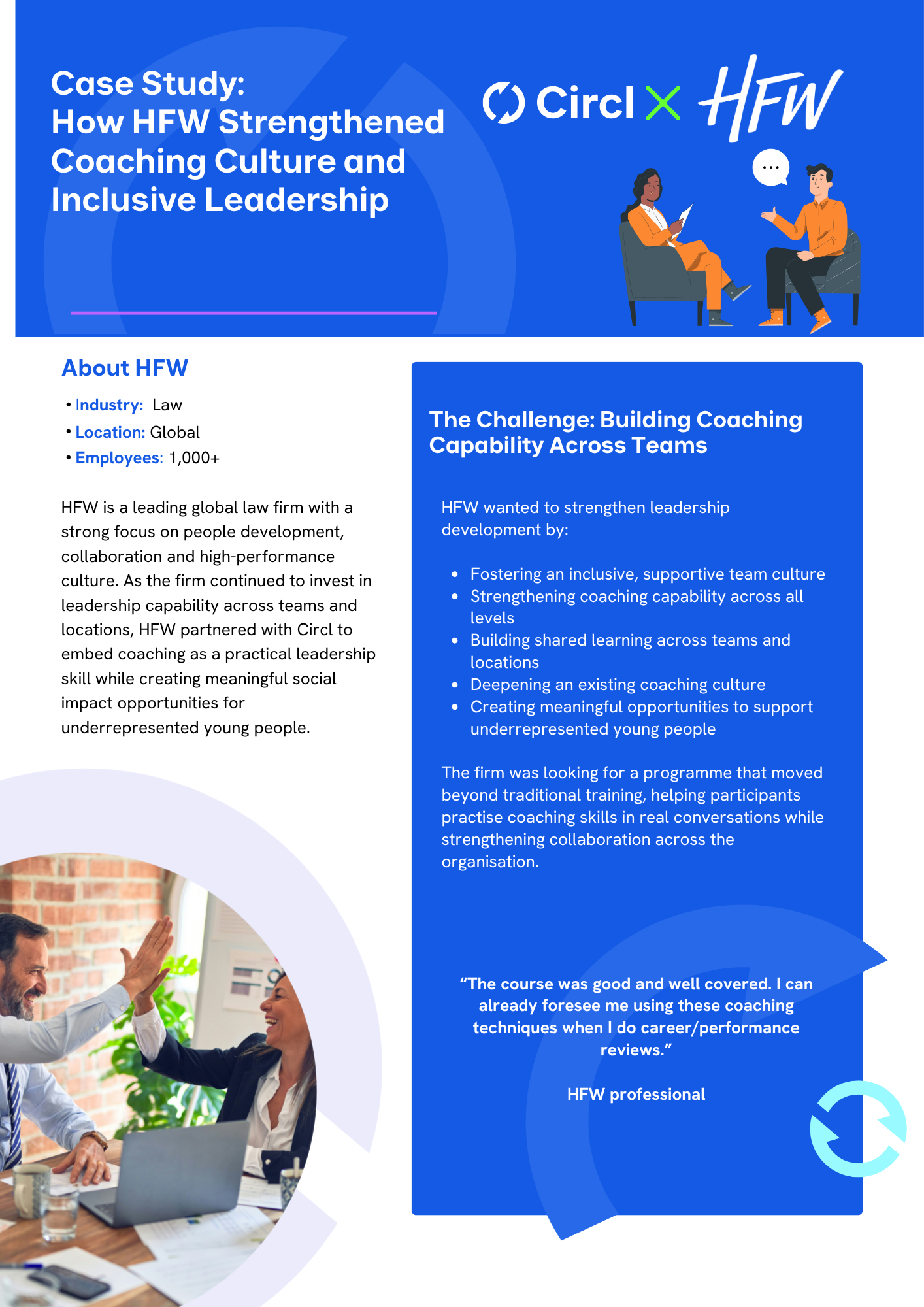 HFW is a leading global law firm with a strong focus on people development, collaboration and high-performance culture. As the firm continued to invest in leadership capability across teams and locations, HFW partnered with Circl to embed coaching as a practical leadership skill while creating meaningful social impact opportunities for underrepresented young people.